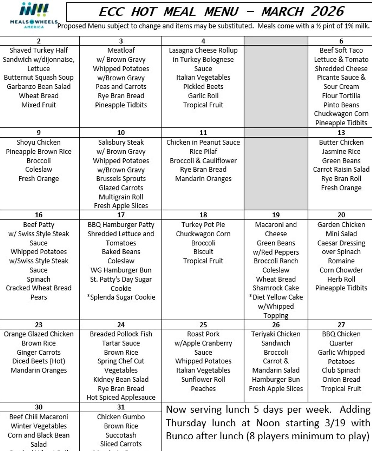 JOIN US FOR LUNCH MONDAY, TUESDAY, WEDNESDAY, THURSDAY STARTING 3/19/2026 AND FRIDAY AT THE CENTER AT NOON. STAY FOR BINGO DIRECTLY FOLLOWING LUNCH. LUNCH IS $4.00. SUGGESTED DONATION FOR THOSE OVER 60.