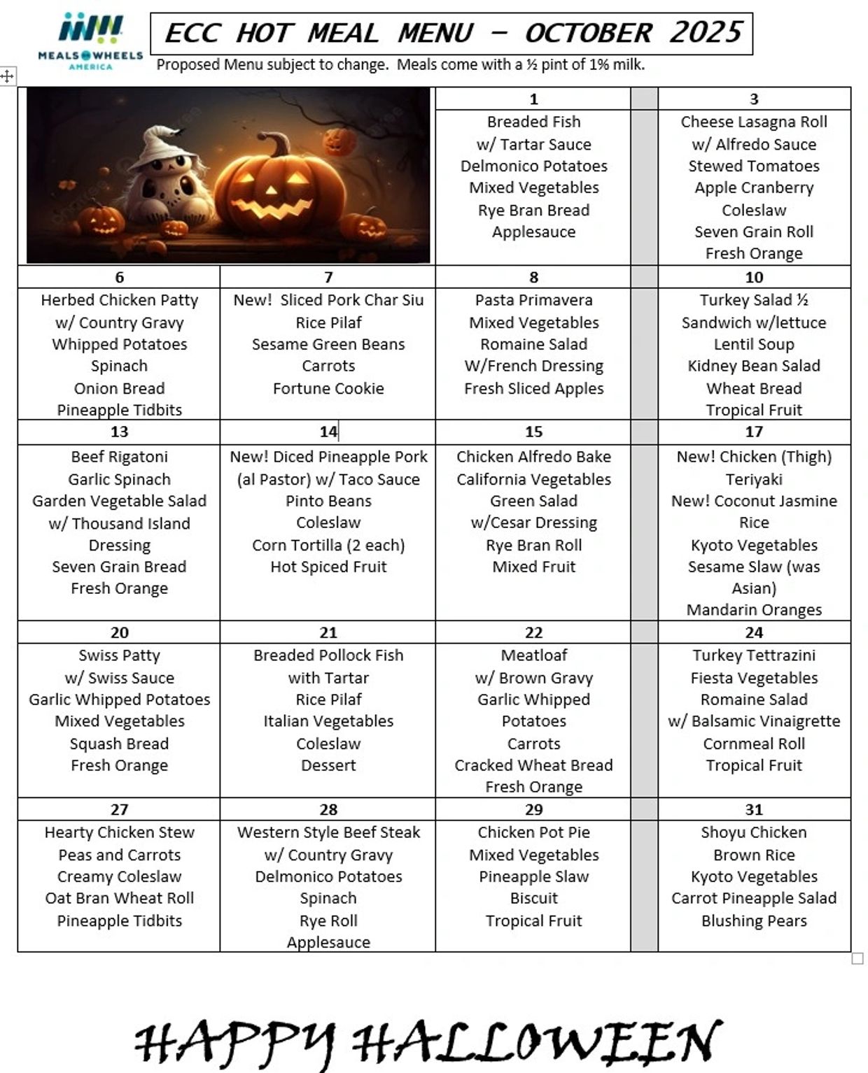 ECC’s Meals on Wheels provides nutritious, hot, home-delivered meals to anyone in our service area who is 60 years old or older AND